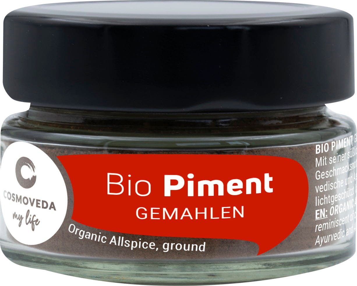 Piment hat eine leichte Schärfe und schmeckt und riecht ein bisschen wie eine Mischung aus Pfeffer, Nelken, Muskat und Zimt. Er passt gut zu Suppen, Eintöpfen, Saucen und Weihnachtsgebäck und wird gerne in Kombination mit Pfeffer, Nelken, Muskat, Zimt und Kardamom verwendet.
