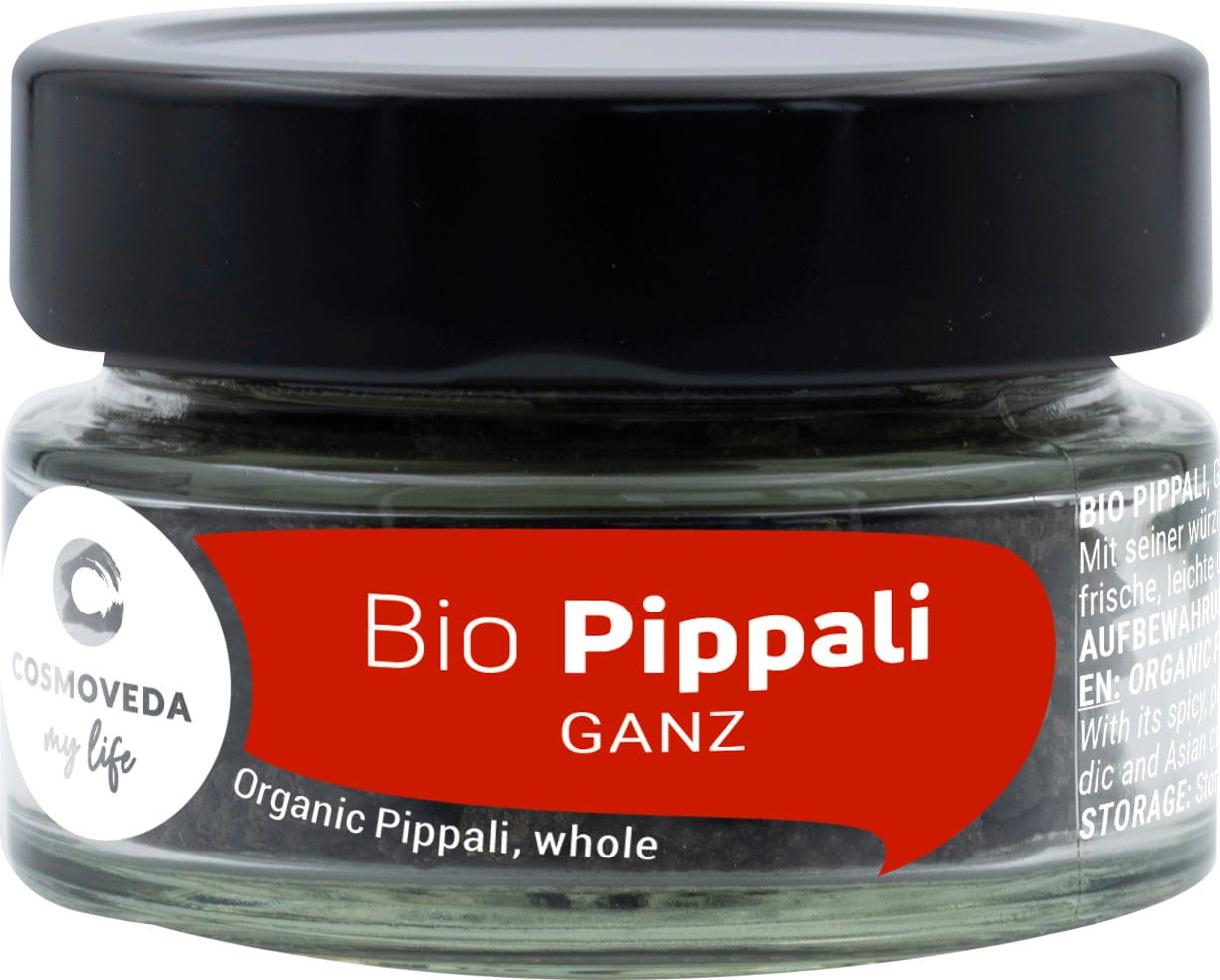 - Er besitzt eine süßlich wärmende, anregende Schärfe. Pippali ist milder als schwarzer Pfeffer.