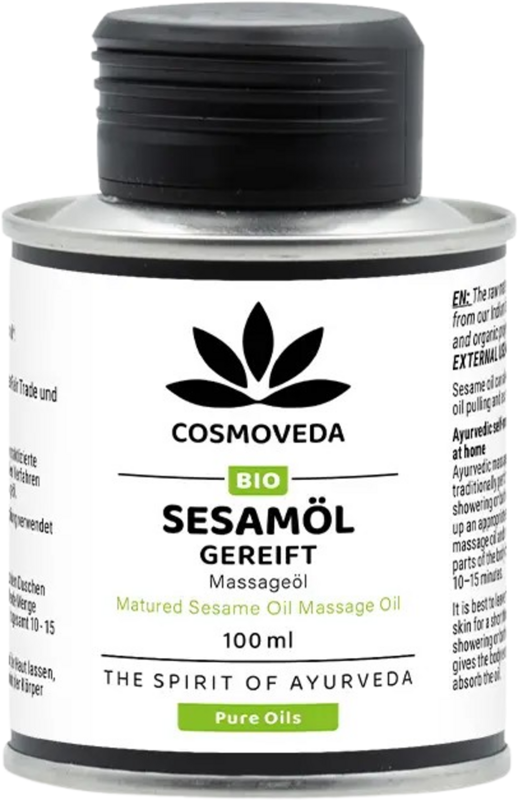 Sesamöl - in der Ayurvedalehre bereits seit Jahrtausenden als Massageöl bekannt und in Verwendung. Cosmovedas Sesamöl wird nach traditionellen Verfahren gereift und ist somit ein erstklassiges Massageöl in Bio-Qualität, das zur Massage aller Körperteile geeignet ist.