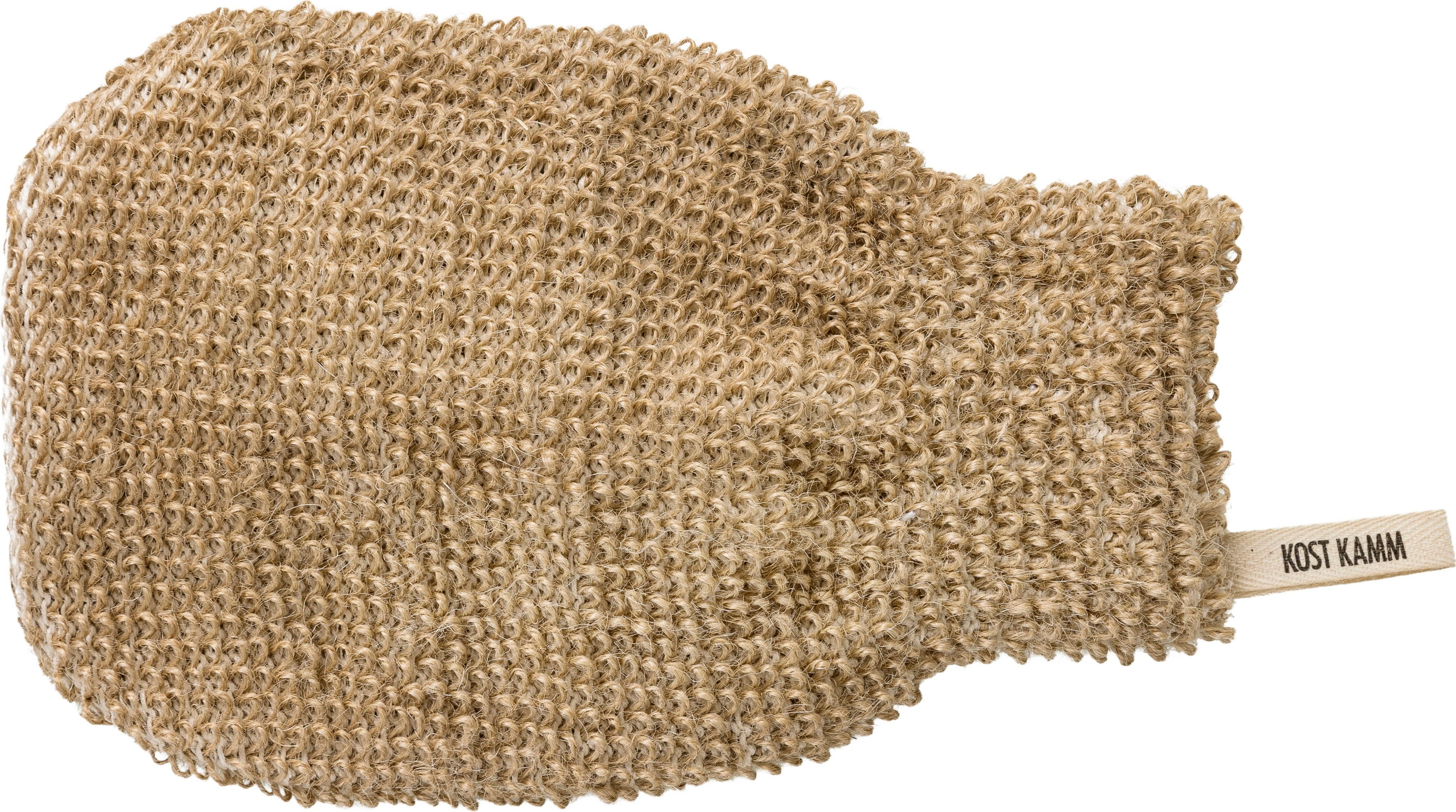 Der Massagehandschuh besteht aus einem gestrickten Jute-Baumwoll-Mix und eignet sich zur Trockenanwendung und für intensive Massagen.