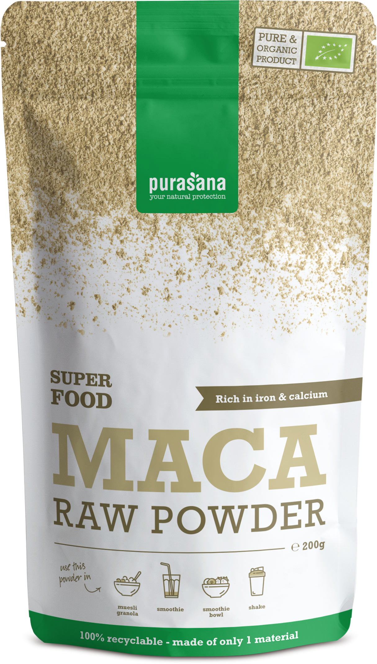 Die Macawurzeln vom Purasana Maca Pulver Bio werden in der Sonne getrocknet und dann gemahlen. Maca ist von Natur aus reich an Calcium und Eisen.