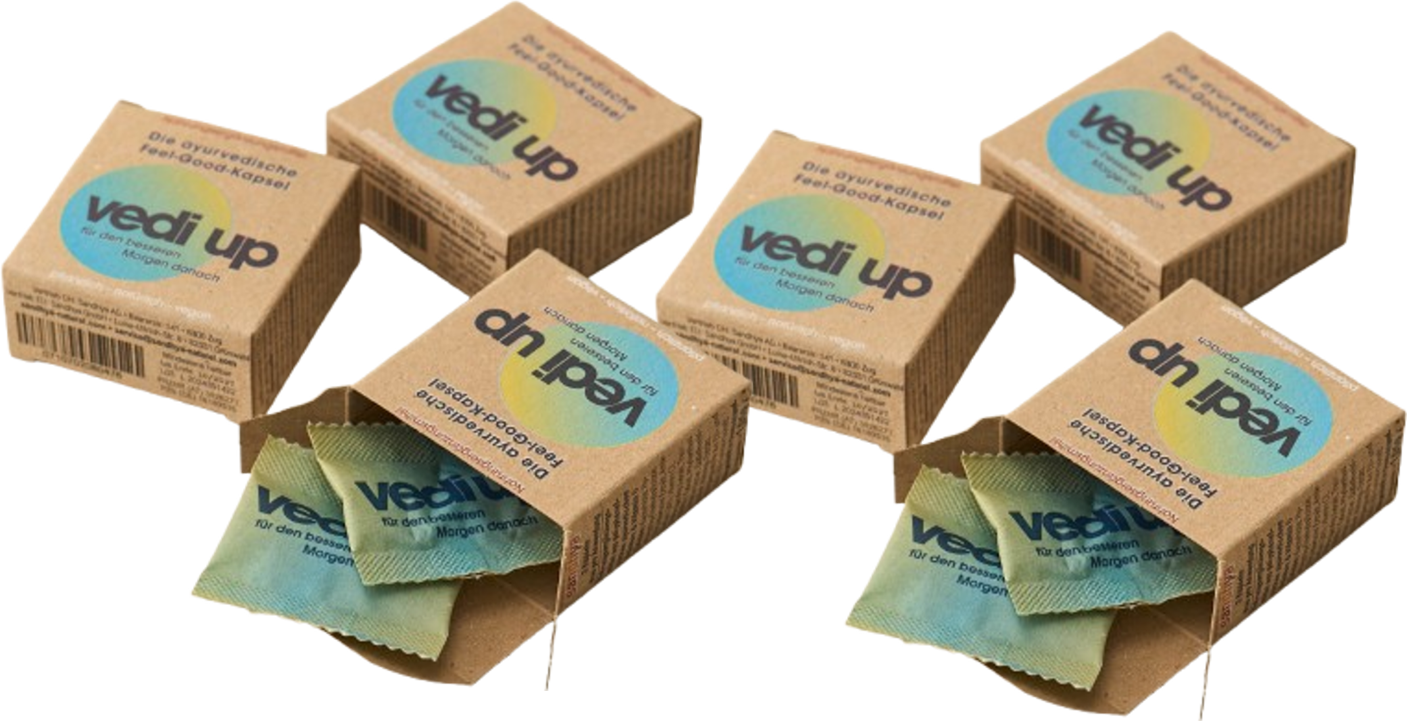 Die vedi up Feel Good Kapseln von Sandhya unterstützen dich auf natürliche Weise nach einem üppigen Essen, während körperlicher Anstrengung oder in stressigen Phasen. Die ayurvedische Rezeptur enthält 7 Pflanzenextrakte, unter anderem aus Chicorée, Amla und Ashwagandha. Die Pflanzenstoffe haben einen hohen Anteil an Bitterstoffen, Vitaminen und Mineralstoffen.